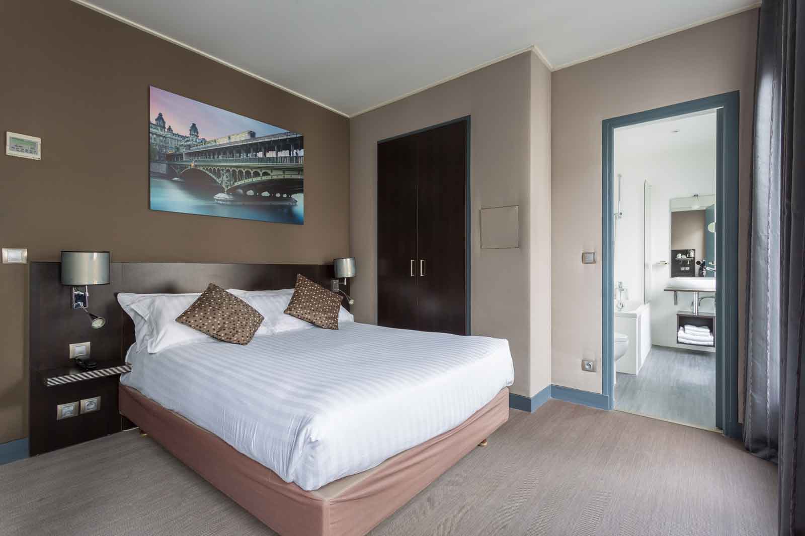 Ein Zimmer mit Doppelbett, auch zur Einzelbenutzung, eine moderne Einrichtung und vielerlei Komfort: diese funktionalen und eleganten Zimmer sind ideal, um in Ruhe wieder aufzutanken nach einem langen Tag.